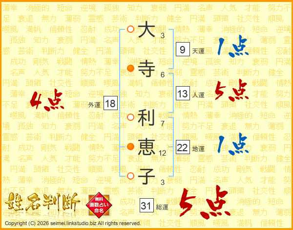 大(3画)寺(6画) 利(7画)恵(12画)子(3画)
