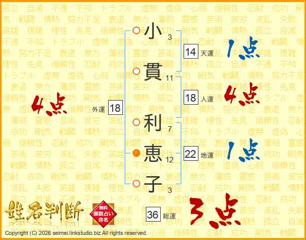 小(3画)貫(11画) 利(7画)恵(12画)子(3画)