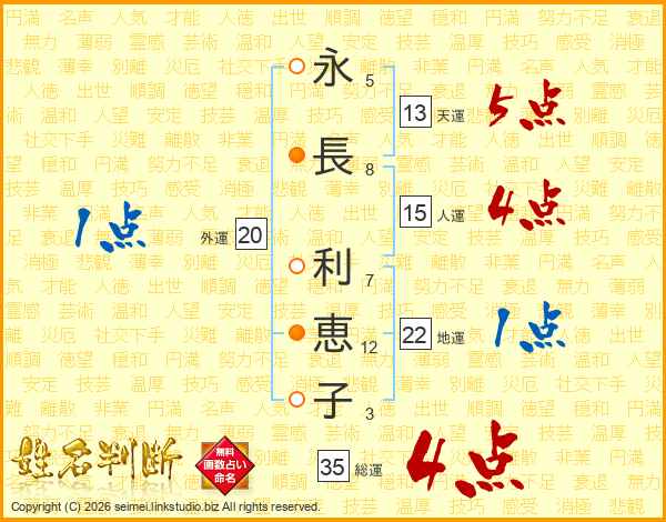永(5画)長(8画) 利(7画)恵(12画)子(3画)