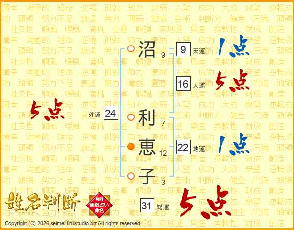沼利恵子さんの総運は31画の5点!