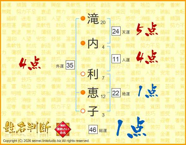 滝(20画)内(4画) 利(7画)恵(12画)子(3画)