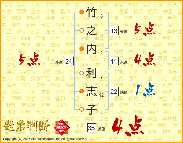 竹(6画)之(3画)内(4画) 利(7画)恵(12画)子(3画)