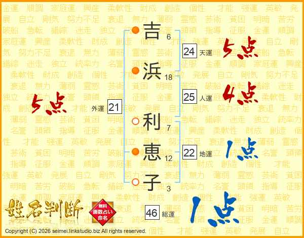 吉(6画)浜(18画) 利(7画)恵(12画)子(3画)