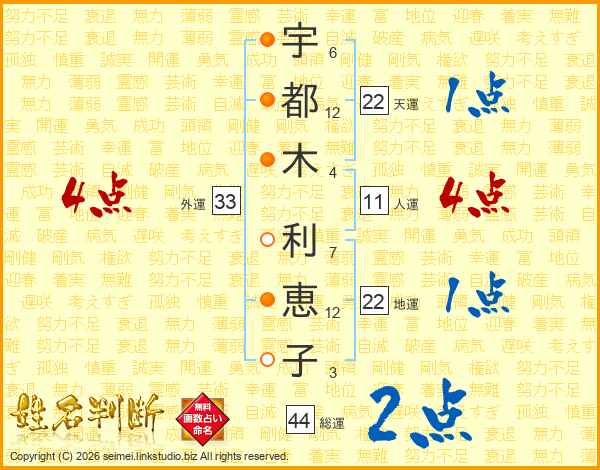 宇(6画)都(12画)木(4画) 利(7画)恵(12画)子(3画)