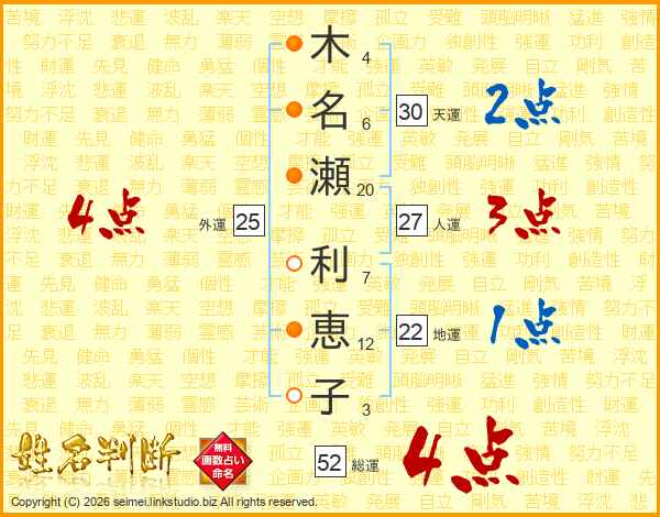 木(4画)名(6画)瀬(20画) 利(7画)恵(12画)子(3画)