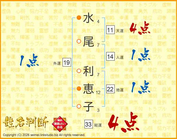 水(4画)尾(7画) 利(7画)恵(12画)子(3画)