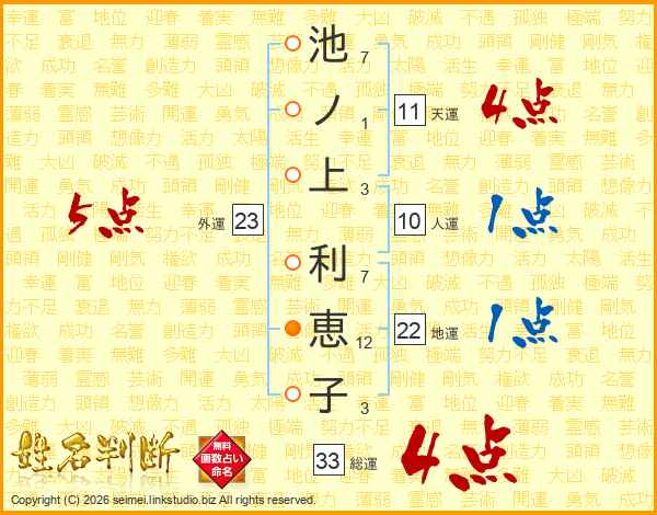 池(7画)ノ(1画)上(3画) 利(7画)恵(12画)子(3画)