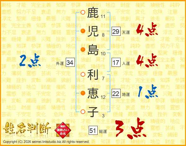 鹿(11画)児(8画)島(10画) 利(7画)恵(12画)子(3画)