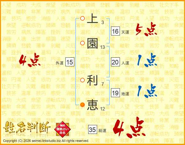 生活面を象徴する運勢です。外部から受ける影響力を表し、結婚運、家庭運や職場、環境への順応性を表します。総運から人運を引いた画数。姓や名が1文字の場合を除く。