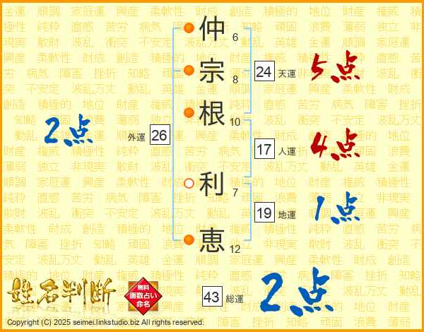 仲(6画)宗(8画)根(10画) 利(7画)恵(12画)