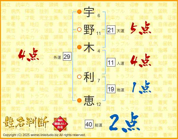 宇(6画)野(11画)木(4画) 利(7画)恵(12画)