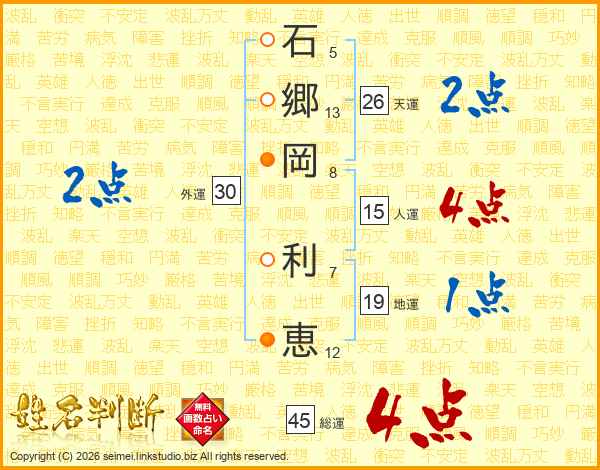 石(5画)郷(13画)岡(8画) 利(7画)恵(12画)