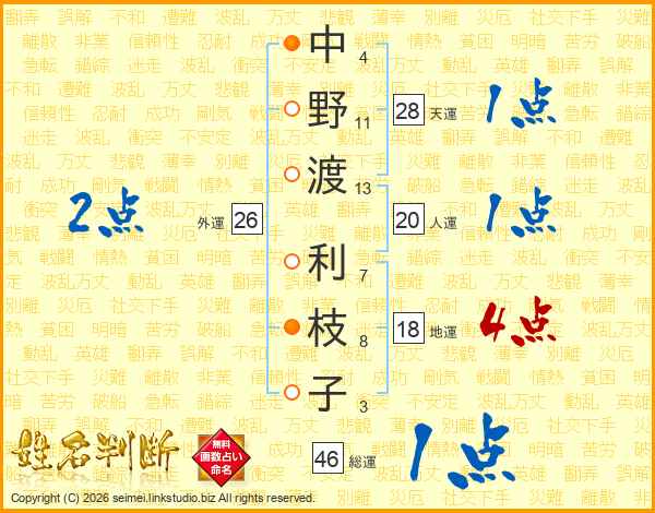 中野渡利枝子さんの総運は46画の1点!