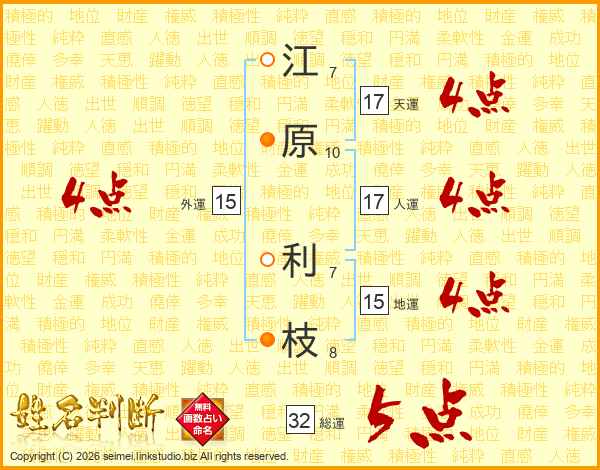 生活面を象徴する運勢です。外部から受ける影響力を表し、結婚運、家庭運や職場、環境への順応性を表します。総運から人運を引いた画数。姓や名が1文字の場合を除く。