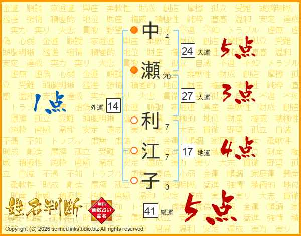 中瀬利江子さんの総運は41画の5点!