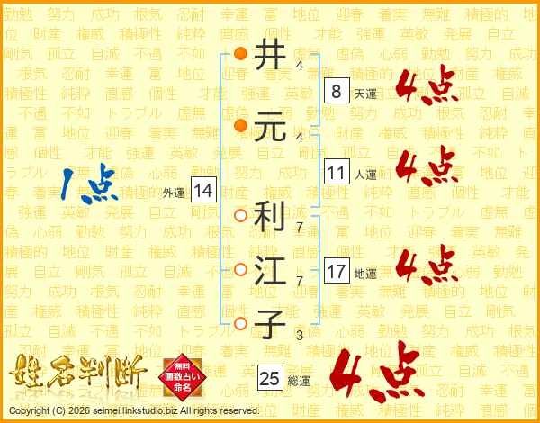 井(4画)元(4画) 利(7画)江(7画)子(3画)