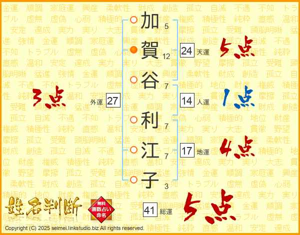 加(5画)賀(12画)谷(7画) 利(7画)江(7画)子(3画)