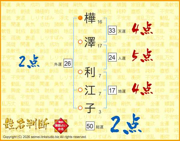 樺(16画)澤(17画) 利(7画)江(7画)子(3画)