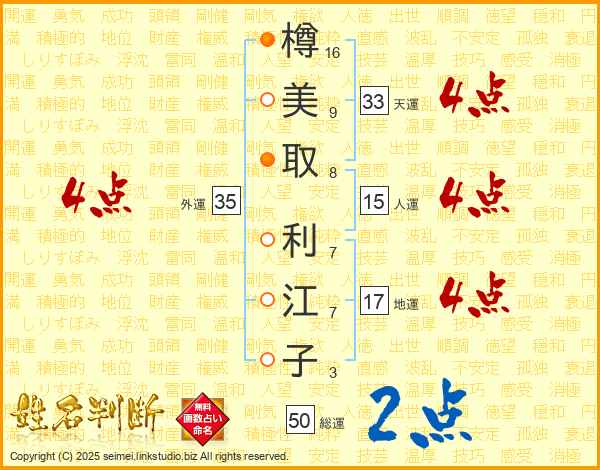樽(16画)美(9画)取(8画) 利(7画)江(7画)子(3画)