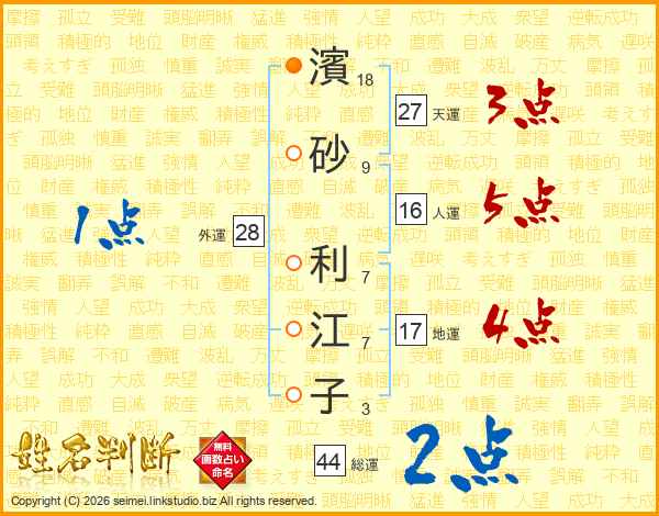 濱(18画)砂(9画) 利(7画)江(7画)子(3画)