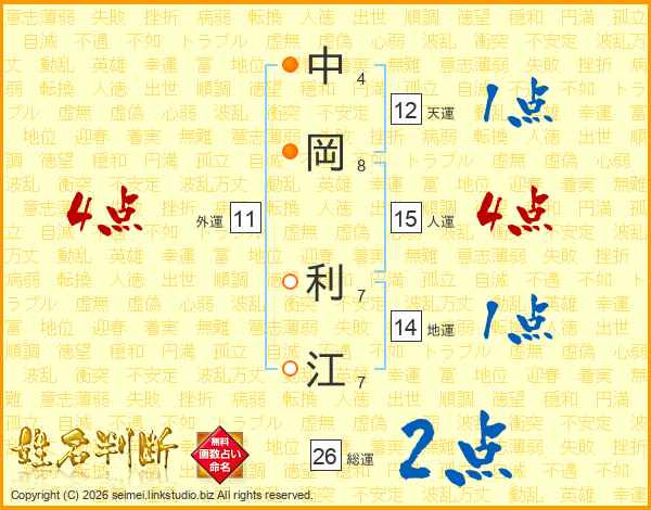 生活面を象徴する運勢です。外部から受ける影響力を表し、結婚運、家庭運や職場、環境への順応性を表します。総運から人運を引いた画数。姓や名が1文字の場合を除く。