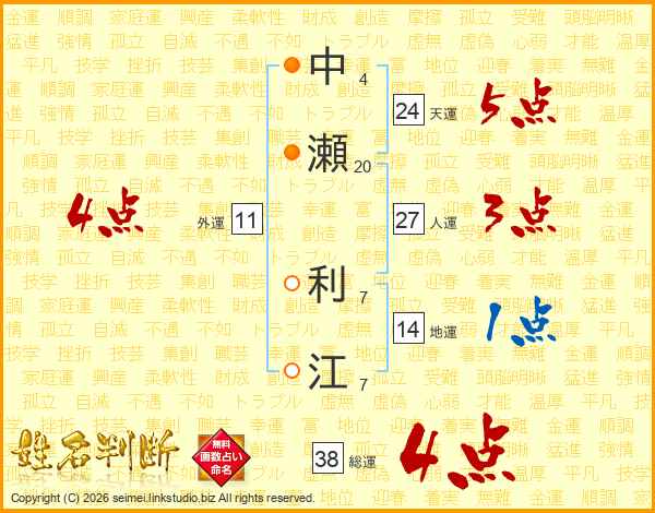 生活面を象徴する運勢です。外部から受ける影響力を表し、結婚運、家庭運や職場、環境への順応性を表します。総運から人運を引いた画数。姓や名が1文字の場合を除く。