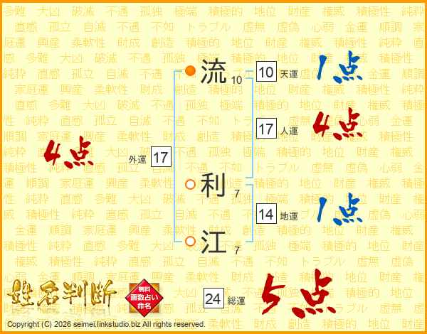 生活面を象徴する運勢です。外部から受ける影響力を表し、結婚運、家庭運や職場、環境への順応性を表します。総運から人運を引いた画数。姓や名が1文字の場合を除く。