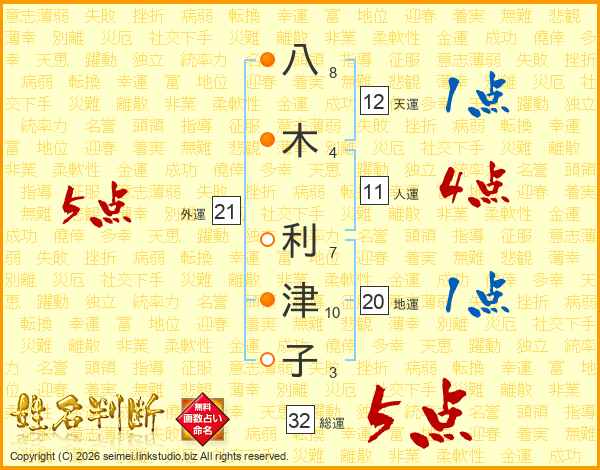 八(8画)木(4画) 利(7画)津(10画)子(3画)