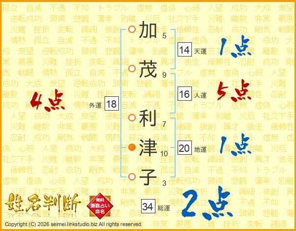 加(5画)茂(9画) 利(7画)津(10画)子(3画)