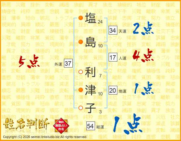 塩(24画)島(10画) 利(7画)津(10画)子(3画)