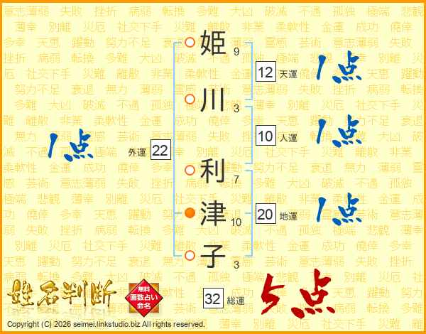 姫(9画)川(3画) 利(7画)津(10画)子(3画)