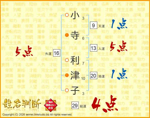 小(3画)寺(6画) 利(7画)津(10画)子(3画)