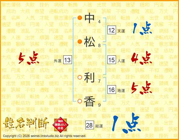 中(4画)松(8画) 利(7画)香(9画)