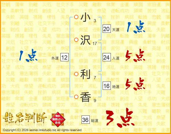 小(3画)沢(17画) 利(7画)香(9画)