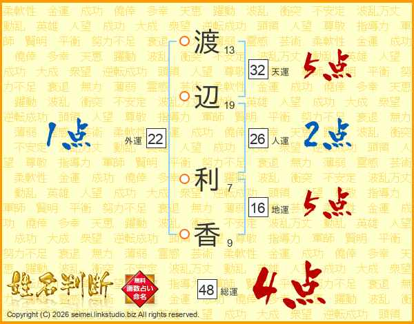 生活面を象徴する運勢です。外部から受ける影響力を表し、結婚運、家庭運や職場、環境への順応性を表します。総運から人運を引いた画数。姓や名が1文字の場合を除く。