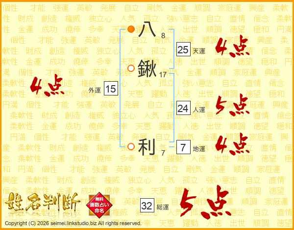 八鍬利さんの総運は32画の5点!