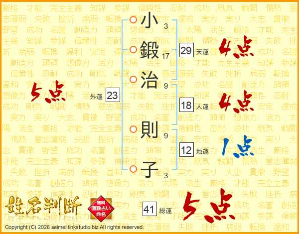 小(3画)鍛(17画)治(9画) 則(9画)子(3画)