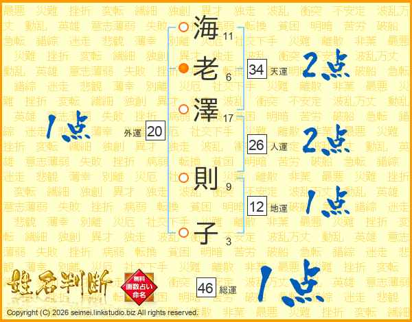海(11画)老(6画)澤(17画) 則(9画)子(3画)