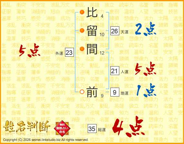 生活面を象徴する運勢です。外部から受ける影響力を表し、結婚運、家庭運や職場、環境への順応性を表します。総運から人運を引いた画数。姓や名が1文字の場合を除く。