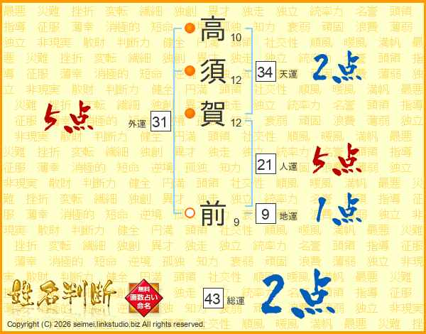 あなたの人生を表す1番重要な運勢です。生涯を通じて影響する総合運となり、主に50歳以降の晩年期に影響を及ぼします。苗字と名前の合計画数。