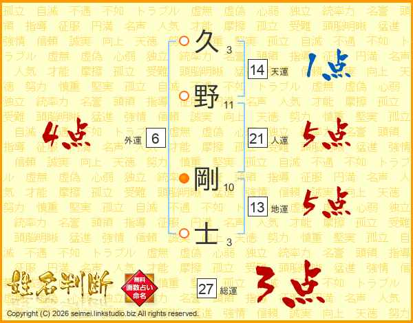 久(3画)野(11画) 剛(10画)士(3画)