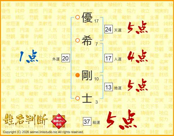 優(17画)希(7画) 剛(10画)士(3画)