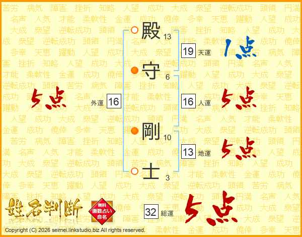 あなたの人生を表す1番重要な運勢です。生涯を通じて影響する総合運となり、主に50歳以降の晩年期に影響を及ぼします。苗字と名前の合計画数。