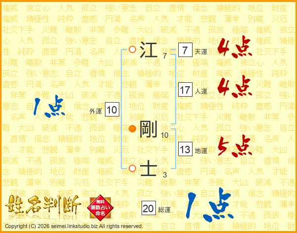 生活面を象徴する運勢です。外部から受ける影響力を表し、結婚運、家庭運や職場、環境への順応性を表します。総運から人運を引いた画数。姓や名が1文字の場合を除く。