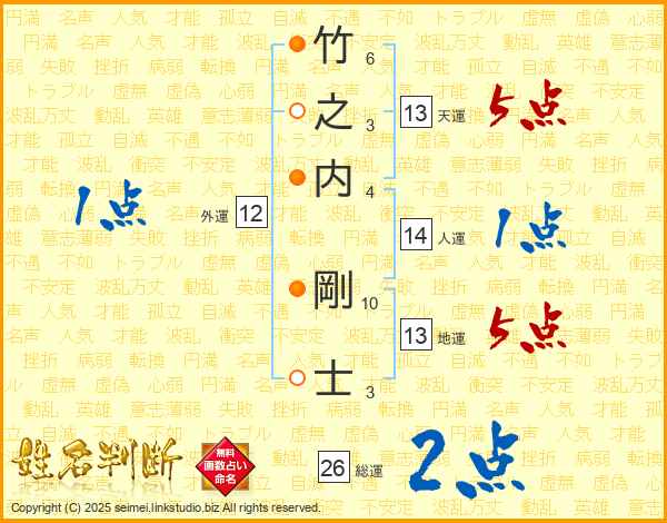 生活面を象徴する運勢です。外部から受ける影響力を表し、結婚運、家庭運や職場、環境への順応性を表します。総運から人運を引いた画数。姓や名が1文字の場合を除く。