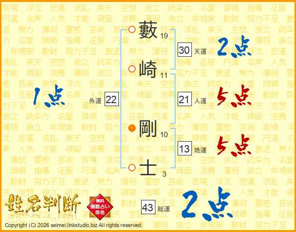 藪崎剛士さんの人運は21画の5点!