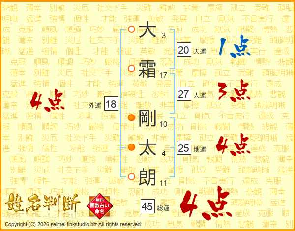 大(3画)霜(17画) 剛(10画)太(4画)朗(11画)