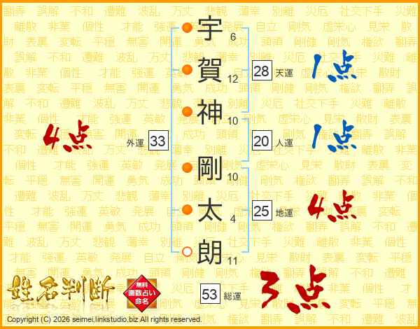 宇(6画)賀(12画)神(10画) 剛(10画)太(4画)朗(11画)
