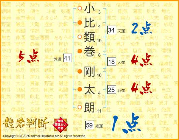 小(3画)比(4画)類(19画)巻(8画) 剛(10画)太(4画)朗(11画)