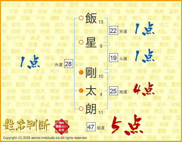 飯(13画)星(9画) 剛(10画)太(4画)朗(11画)